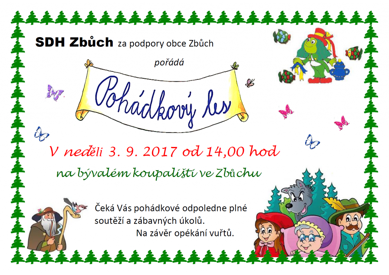 Srdečně zveme všechny děti, na zábavné odpoledne konané dne 3.9.2017 od 14:00 h na bývalém koupališti ve Zbůchu.