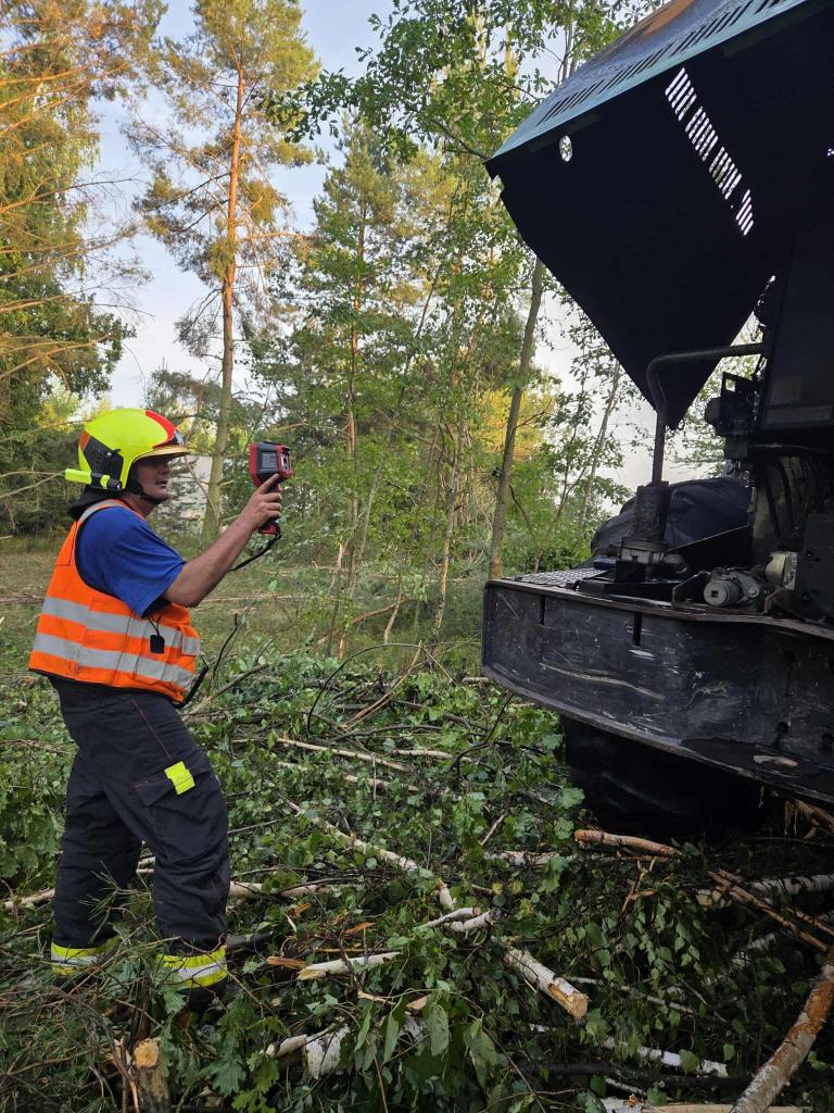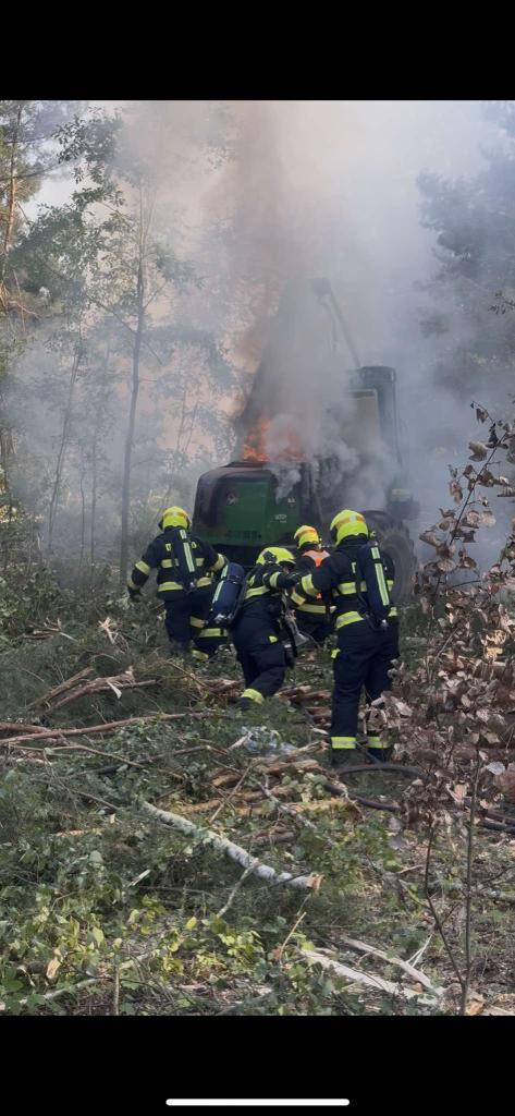 Dne 14. 8. 2025 v 18:02 vyjela jednotka na žádost KOPIS Pk s CAS 20 SCANIA v počtu 1+5 a s DA L2Z GAZ v počtu 1+3 k nahlášenému požáru harvestoru do areálu letiště Líně. Po příjezdu na MU byl průzkumem potvrzen požár harvestoru v plném rozsahu hoření. Dle prvotního průzkumu bylo epicentrum požáru v oblasti motorového prostoru stroje. Jednotka neprodleně nasadila vysokotlaký proud, kterým došlo k omezení šíření požáru, a následně jeden útočný proud C, kterým byl postup požáru zastaven zcela. Po příjezdu jednotky HZS HS Nýřany si velení na MU přebírá VD JPO HZS HS Nýřany a došlo k nasazení 2. útočného proudu a následné eliminaci plamenného hoření. Poté bylo přistoupeno k otevření krytu motorové části harvestoru, který byl kompletně prozkoumán s využitím termokamery k odhalení a dohašení skrytých ohnisek. Po likvidaci požáru se jednotka z rozkazu VZ vrací zpět na základnu.